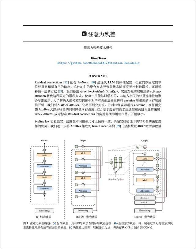 事情的起因,是3月16日月之暗面Kimi发布的一篇重磅技术报告《Attention Residuals》,直接把大模型领域十年未变的底层架构给“卷”出了新高度。要知道,过去十年里,大模型的残差连接都走的“大锅烩”路线,把各层信息一股脑相加,这就很可能会丢失关键信息,还可能就是纯纯浪费算力。